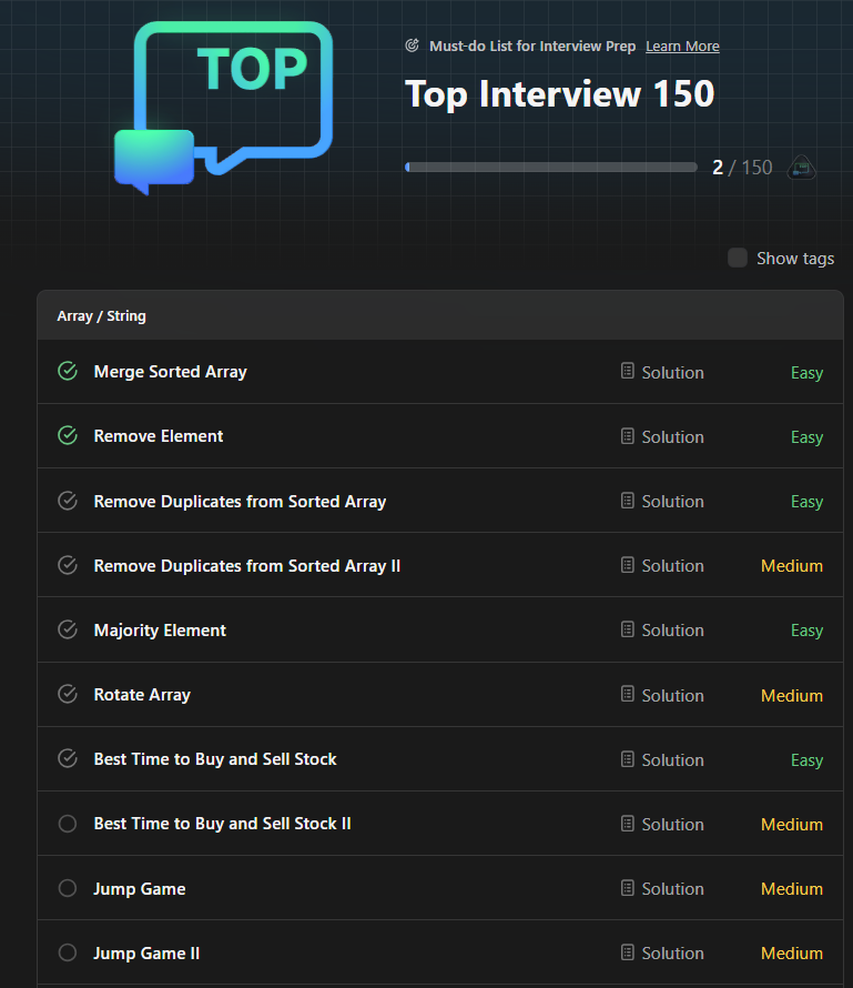99ํด๋ฝ ์ฝํ ์คํฐ๋๊ฐ ๋๋๊ณ ์๋กญ๊ฒ Leetcode top interview 150๊ฐ ๋ฌธ์ ๋ฅผ ํธ๋ ์คํฐ๋๋ฅผ ์์ํ๋ค.