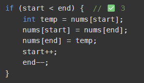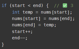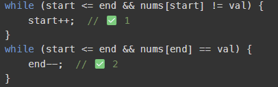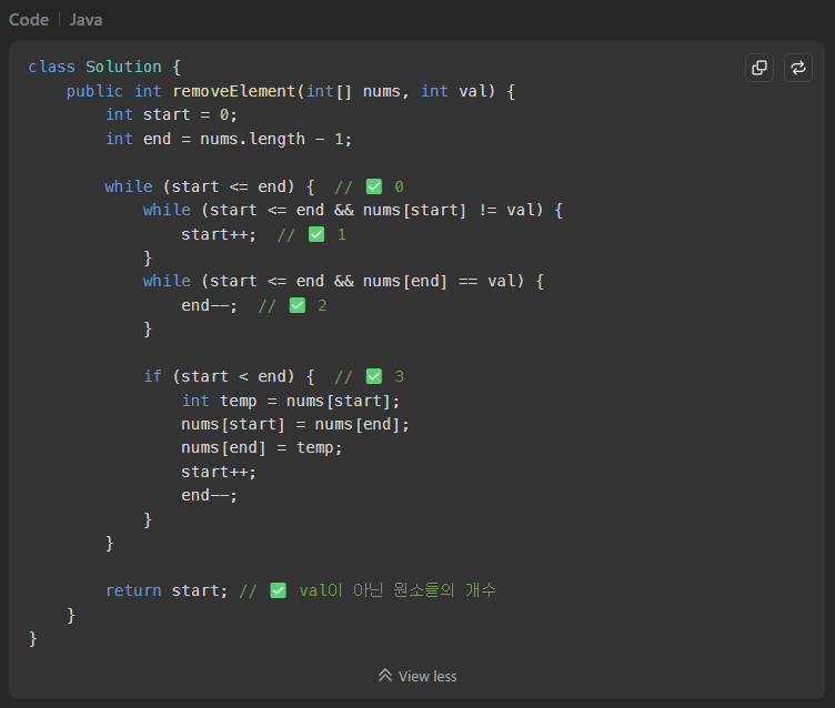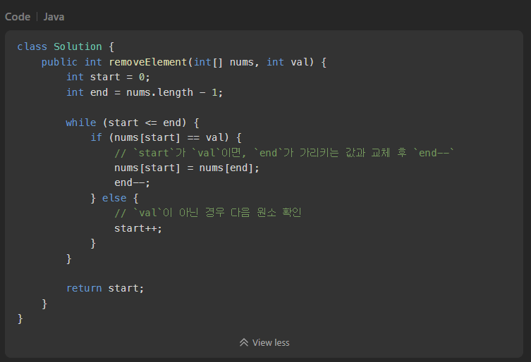 start๋ remove ํด์ผ ๋ ๊ฐ, end๋ remove ํ์ง ์์์ผ ํ ๊ฐ์ ๊ฐ๋ฅดํค๊ณ ์๊ธฐ ๋๋ฌธ์ ์ด ๋ ๊ฐ์ swap ํด์ฃผ์์ง๋ง ๋ง์ฝ start๊ฐ end๋ณด๋ค ๊ฐ์ผ๋ฉด ๋ถํ์ํ swap์ ํ์ง ์์๋ ๋๊ณ , start๊ฐ end๋ณด๋ค ํฌ๋ค๋ฉด ์ด๋ฏธ ์ด๋ก์ ๋ถ๋ถ nums[0...start) ๊น์ง๋ val ๊ฐ์ด ์ ๊ฑฐ๋ ์์๋ค๋ง ๋ค์ด๊ฐ ์๊ธฐ ๋๋ฌธ์ swap์ ํ์ง ์์์ผ ํ๋ค.