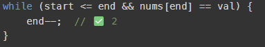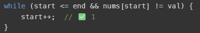 ์ด๊ฑด ๋ด๊ฐ ์์ฑํ ์ฝ๋๋ณด๋ค ๊ฐ๊ฒฐํ๋ฐ start๋ ์์์ end๋ ๋ค์์๋ถํฐ ํ์ธํ๋๋ฐ start์ ๊ฐ์ด val์ผ ๊ฒฝ์ฐ ์ด ๊ฐ์ remove๋์ด์ผ ํ๋๊น ๋ค์์ ๊ฐ์ ๋ฃ์ด์ฃผ๊ณ ํ์นธ์ฉ ์์ผ๋ก ์ด๋ํ๋ค. ๊ทธ๋ฐ๋ค์ start๊ฐ์ด val์ด ์๋๋ฉด ํ์นธ์ฉ ์์ผ๋ก ์ด๋ํ๋ค.