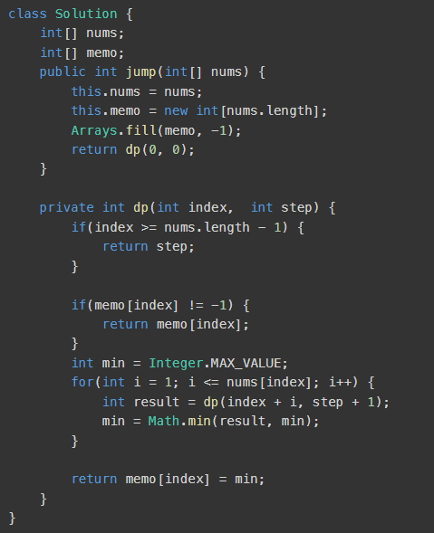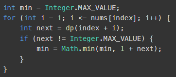 ๊ทธ๋ฆฌ๊ณ min = Math.min(min, 1+ next) ์ฌ๊ธฐ์ ์คํ ๊ฐ์ ํ๋ ๋ ํด์ค์ผ๋ก์จ ํด๋น ์ธ๋ฑ์ค์์๋ for๋ฌธ์ ๋ค ๊ฒ์ํ ๋ค ์ต์๊ฐ์ ์ ์ฅํ ์ ์๋ค.