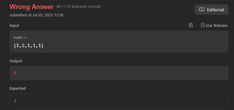 ์ธํ๊ฐ์ด nums = [1, 2, 1, 1, 1] ์ผ๋ ๋ด๊ฐ ์์ฑํ ์ฝ๋๋ ์ ๋ต ์ฝ๋๋ฅผ ๋น๊ตํด๋ณด๋ฉด ์ธํ๊ฐ์ด wrong answer๊ฐ ๋์จ๋ค.