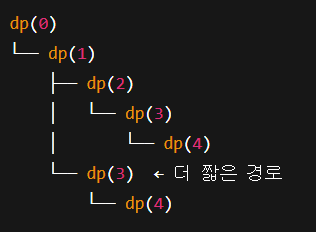 ์คํ์์๋ ๋๊ฐ์๋ฐ dp(0) -> dp(1) -> dp(3) ์ผ๋ก ๊ฐ๋ ๊ฒฝ๋ก๊ฐ ์ ์ผ ์งง์ง๋ง ์ด๊ฑธ ๋ฐ์์ ๋ชป ํด์ฃผ๋ ๊ฒ ๊ฐ๋ค. ๋ ์ฝ๋์ ์ฐจ์ด๋ ์ ๋ต์ฝ๋๋ step์ ๋ด๋ถ์ ์ผ๋ก ๋ค๋ฃจ๊ณ (๋ฉ๋ชจ์ ๋ฐ์ X), ๋ด ์ฝ๋๋ step์ ์ธ์๊ฐ์ผ๋ก ๊ณ์ ๋๊ฒจ์ฃผ๊ณ ์๋ค. ์คํ ์์๋๋ก ๋ ธํธ์ ๊ฐ์ด ์ด๋ป๊ฒ ๋์ด๊ฐ๋์ง ๊ทธ๋ ค๋ณด๋ฉด ๋ด ์ฝ๋๋ ๋ ์งง์ ๊ฒฝ๋ก ์ ์ ์ด๋ฏธ memo๊ฐ์ ์ ๋ฐ์ดํธ ํด์คฌ๊ธฐ ๋๋ฌธ์ dp(4, 3)์ ํธ์ถ ํ ๋ ๊ธฐ์กด์ ์ ์ฅ๋ ๊ฐ์ ๋ฆฌํดํด์ ์ต์๊ฐ์ ์ ๋ฐ์ดํธ ํ์ง ๋ชปํ๋ค.