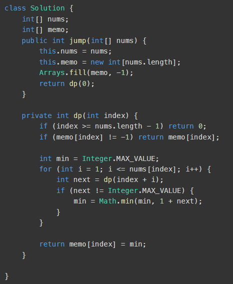 ๋จผ์ ์์ ์์น ๊ฐ์ dp[0] = 0์ผ๋ก ์ธํ ํด์ฃผ๊ณ ์ธ๋ฑ์ค ๊ธธ์ด๋งํผ ๋ฐ๋ณต๋ฌธ์ ๋๋ฉด์ dp[i + j] ๊ฐ์ ๊ฐฑ์ ํด์ค๋ค. ๊ทธ๋ฆฌ๊ณ ๋ฐ๋ณต๋ฌธ์ด ๋ค ๋๋๋ฉด dp[n - 1] ๊ฐ์ฅ ๋ง์ง๋ง ์์น๋ฅผ ๋ฆฌํดํ๋ค. ์ง๊ธ๊น์ง bottom-up ๋ฐฉ๋ฒ์ด ๋ ์ด๋ ต๋ค๊ณ ์๊ฐํ๋๋ฐ ๊ด์ฐฎ์ ๊ฒ ๊ฐ๊ธฐ๋ ํ๊ณ ... ๋ค์ dp ๋ฌธ์ ๋ ์ด ๋ฐฉ๋ฒ์ผ๋ก๋ ํ์ด๋ด์ผ๊ฒ ๋ค.
