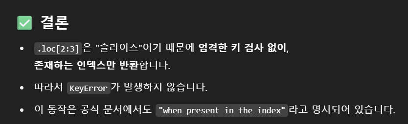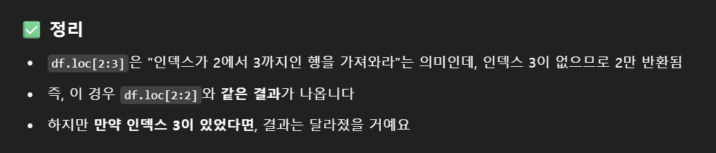 ํ๋ฆฐ 3๋ฒ์งธ ๋ฌธ์ ๋ฅผ ๋ณด๋ฉด 'loc ๋ฉ์๋์ ์ฌ๋ผ์ด์ฑ์ ์ฌ์ฉํ๋ฉด ๋ง์ง๋ง ์ธ๋ฑ์ค๋ฅผ ํฌํจํ๋ค'๋ผ๋ ํํธ๊ฐ ์์๋ค. ๊ทผ๋ฐ 3๋ฒ์งธ ํ์ ๊ณจ๋ผ๋ด๋๋ฐ ์ด๋ป๊ฒ df.loc[2:2]๋ df.loc[2:3] ์ด ์ ๋ต์ผ ๋ ์ ์์ง? ๋ชจ๋ฅด๊ฒ ์ผ๋๊น ์ง์ ์ฝ๋ฉ์์ ์ค์ตํด๋ดค๋ค.