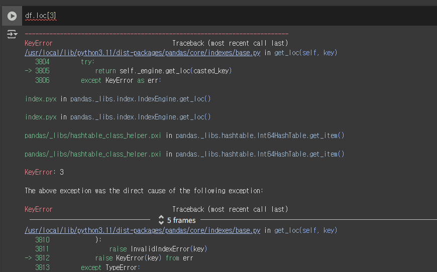 ์ฐ์ df์์๋ ์ธ๋ฑ์ค 3์ด ์์๊ธฐ ๋๋ฌธ์ ๋๊ทธ๋ฌ์ด ํ๋ค์ค๋ ์๋ ์ธ๋ฑ์ค๋ฅผ ์ ์ธํ๊ณ ์ธ๋ฑ์ค 2๋ง ์ ๊ฐ์ ธ์๋ค๋ ๊ฑด๋ฐ