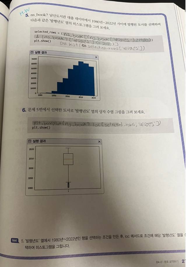 '๋ถํฌ ์์ฝํ๊ธฐ'์์๋ ๋ฐ์ดํฐ ๋ถํฌ๋ฅผ ๊ทธ๋ํ๋ก ๋ํ๋ผ ์ ์๋ ์ฐ์ ๋(scatter plot), ํ์คํ ๊ทธ๋จ(histogram), ์์ ์์ผ ๊ทธ๋ฆผ(box=and-whisker plot)์ ๋ํด ๋์ค๋๋ฐ ๊ทธ๋ํ๋ฅผ ๊ทธ๋ฆฌ๋ ค๋ฉด ๋งทํ๋กฏ๋ฆฝ(matplotlib)์ด ํ์ํ๋ค.