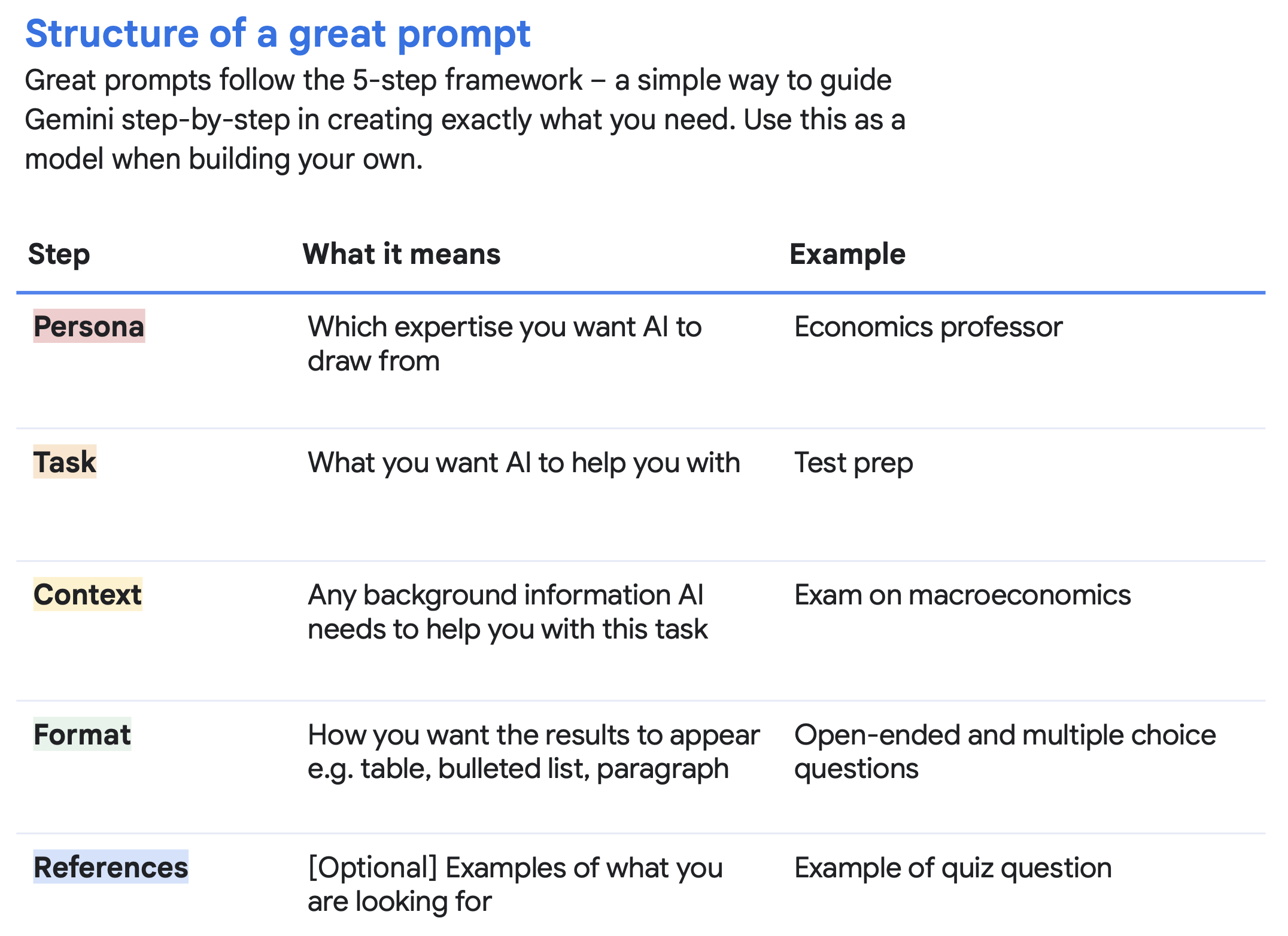 κ΅¬κΈ μ λ―Έλμ΄μ essential guideλ₯Ό 보면 λΉμ·ν λ΄μ©μ΄ μλ€. ν둬ννΈλ₯Ό μμ±ν λ 5λ¨κ³λ‘ Persona, Task, Context, Format, Referencesλ₯Ό μ 곡νλ©΄ λ μ’μ λ΅λ³μ λ°μ μ μλ€. μ΄λ»κ² μ§λ¬Ένλ©΄ μ’μμ§λ AI νν λ¬Όμ΄λ΄μ μ§λ¬Έμ λν νΌλλ°±λ λ°μ μ μλ€.