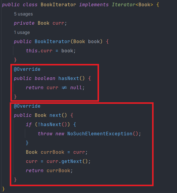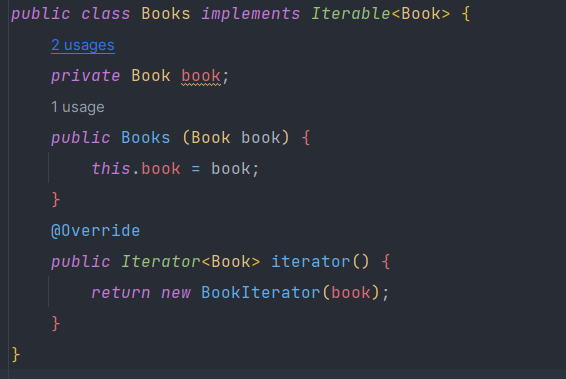 ํ์ง๋ง Books ํด๋์ค๋ List๋ก Book์ ๊ฐ์ง๊ณ ์์ด์ ๊ตฌํ์ด ์ฌ์ ์ง๋ง iterator() ๋ฉ์๋๋ฅผ ์ง์ ๊ตฌํํด์ผ ๋ ๋๋ hasNext()์ next() ๋ฉ์๋๋ฅผ ๋ง๋ค์ด ์ฃผ์ด์ผ ํ๋ค.