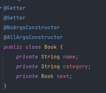 Book ํด๋์ค๋ฅผ ์กฐ๊ธ ์์ ํ๋๋ฐ ๋ค์ Book ๊ฐ์ฒด์ reference๋ฅผ ๊ฐ์ง๊ณ ์์ next ํ๋๋ฅผ ์ถ๊ฐํ๋ค.