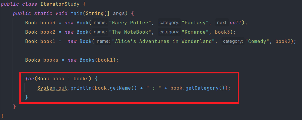 Iterator๋ฅผ ์์๋ฐ์ custom BookIterator๋ฅผ ๋ง๋ค์ด์ ์ง์ hasNext()์ next() ๋ฉ์๋๋ฅผ ์ค๋ฒ๋ผ์ด๋ ํด์ฃผ๊ณ ๋๋ฉด