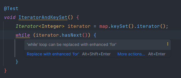 ๊ทธ๋ฐ๋ฐ iterator๋ก Map์ ์ํํ๋ ์ฝ๋๋ฅผ ์์ฑํ๋ฉด ์ธํ ๋ฆฌ์ ์ด์์๋ ํฅ์๋ for๋ฌธ์ผ๋ก ๋ณ๊ฒฝํ ์ ์๋ค๊ณ ํ๋ค.